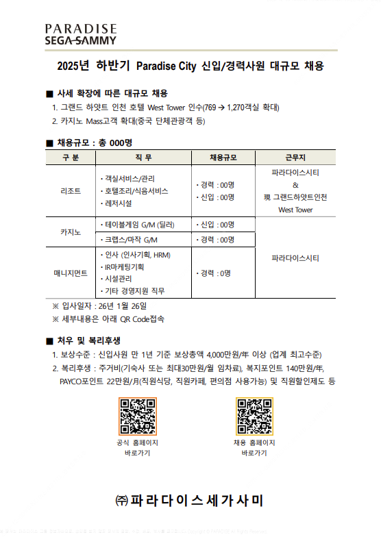 [파라다이스세가사미] 현장 채용설명회 안내문